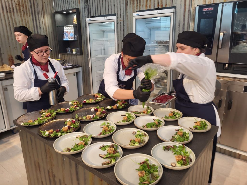 Freude bereitete dem Trainerteam – Fachlehrer Stefan Keßler von der Eduard-Stieler-Schule und Anna-Marie Blum vom Verein der Köche Fulda – , dass die jungen Wettbewerbsteilnehmer des 3. Ausbildungsjahres mutiges Würzen und klare Produktstrukturen erkennen ließen. Mit nur zwei Besprechungen und zwei Probeläufen hatte die Gruppe ihr Menü entwickelt, das durch Balance und Textur bestach. Besonders bemerkenswert: Laura Veth sprang kurzfristig als Ersatz für die ausgefallene Laura-Sophie Brehl vom Gasthof Rhönblick in Wissels ein ohne vorher an einem Probekochen teilgenommen zu haben und fügte sich nahtlos ins Team ein.
