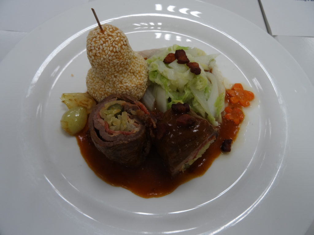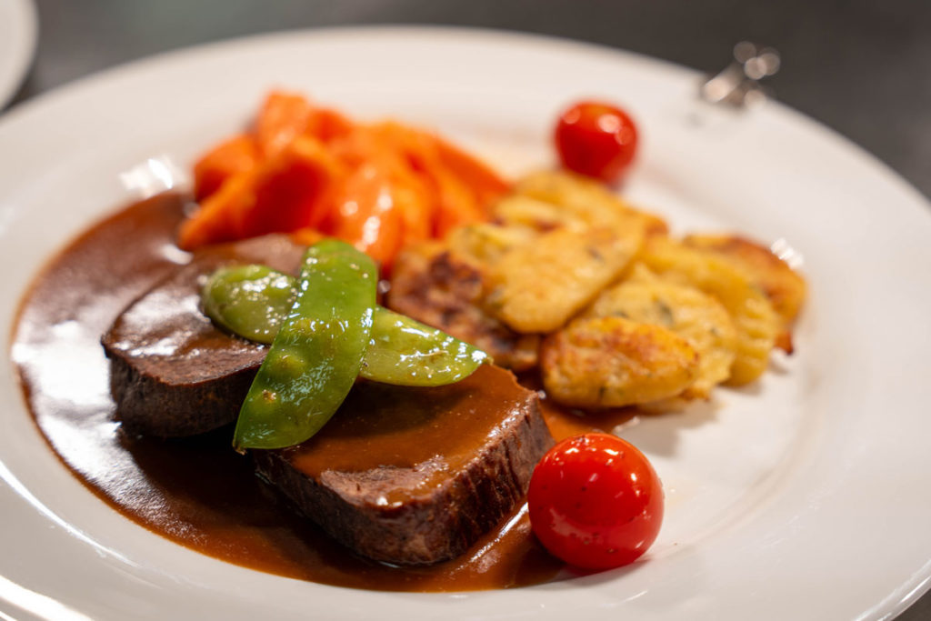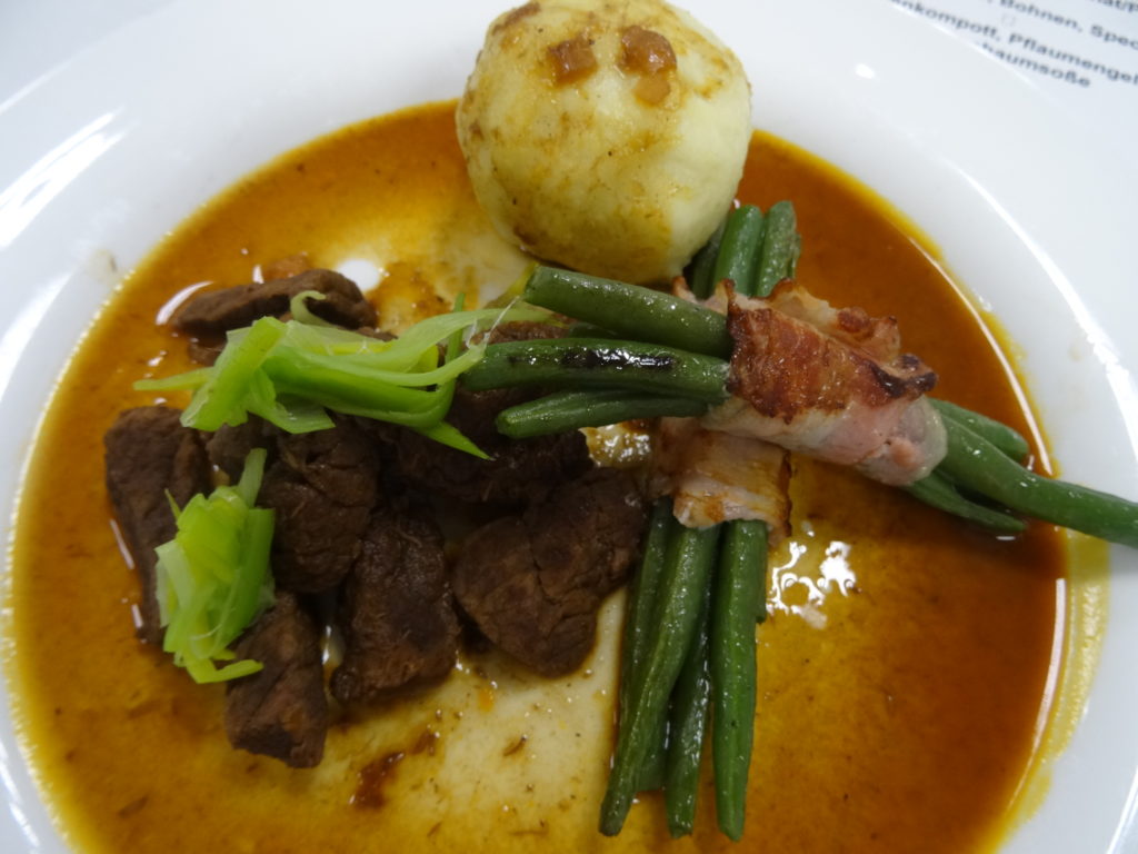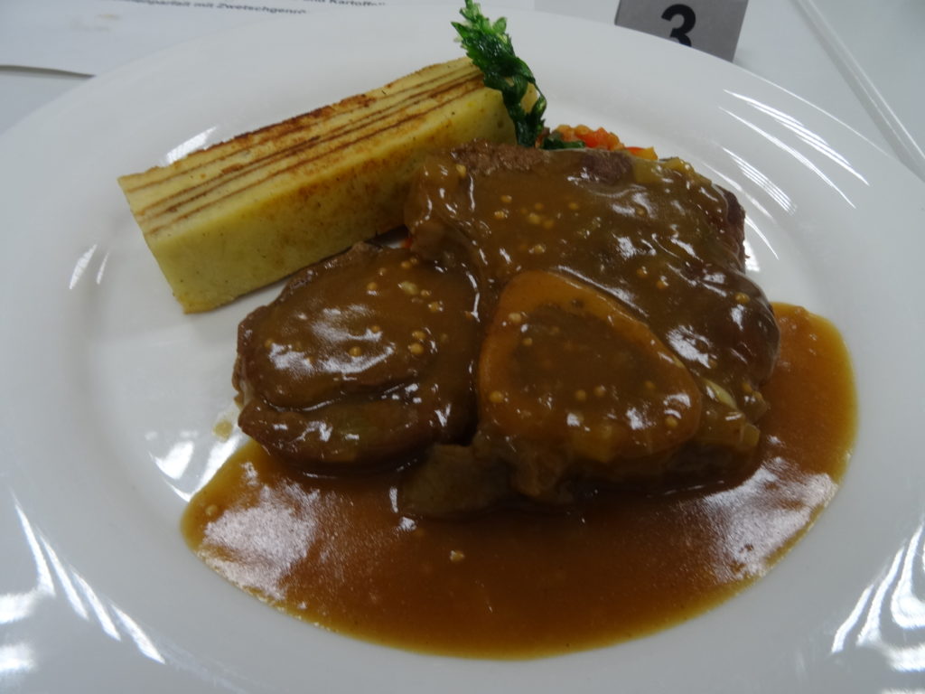 Hauptgang: Geschmorte Zubereitung aus Fleisch, Soßenableitung, Gemüsebeilage, Sättigungsbeilage aus Kartoffelmasse unter Verwendung von Eigelb/Ei