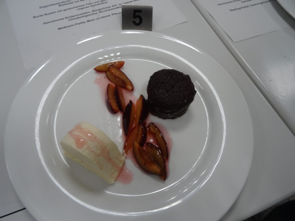 Dessert: Parfait, Pflaumen/Zwetsche, pochierter Pudding /z.B. Mohr im Hemd, Plumpudding, Sächsischer Pudding, o.ä.