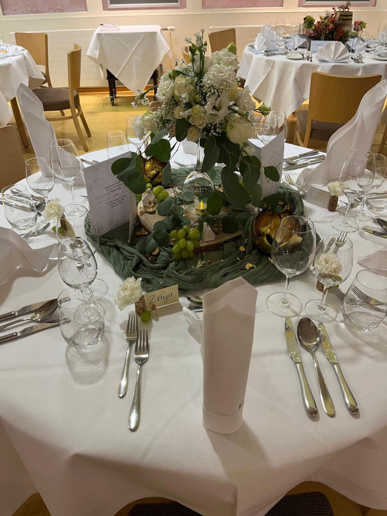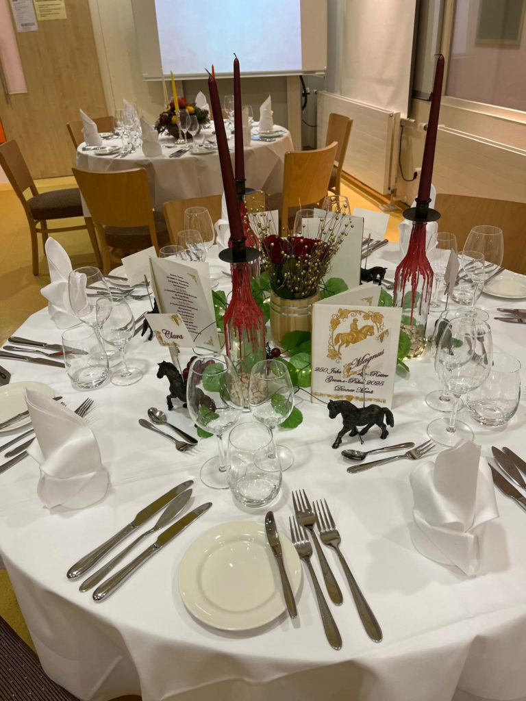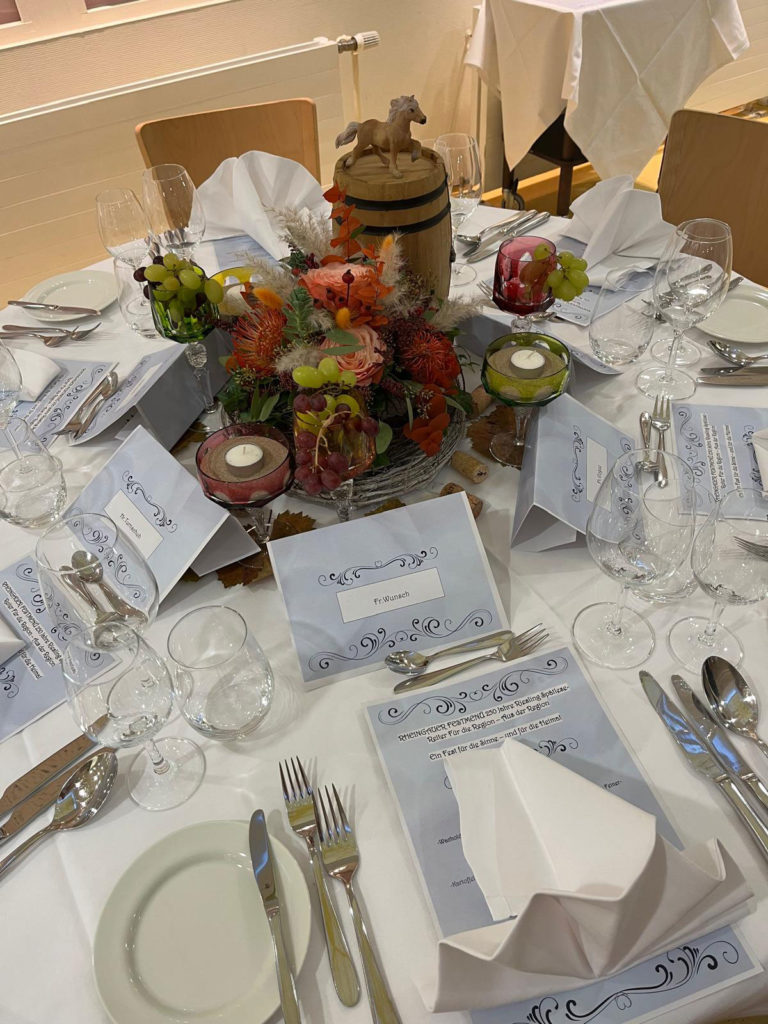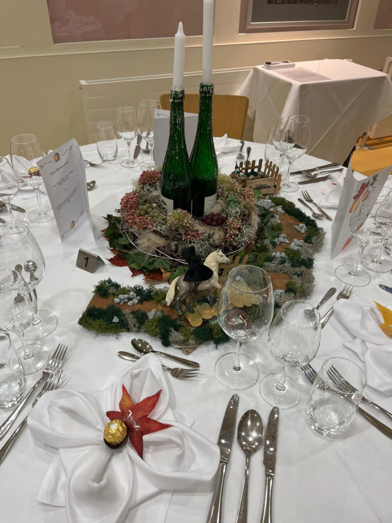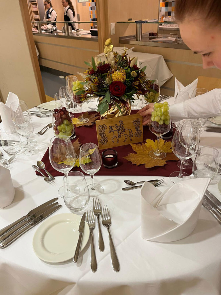 Die Teilnehmer/innen aus den Serviceberufen hatten die Aufgabe das Thema Riesling Spätlese-Reiter in der Tischdekoration umzusetzen.